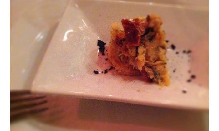 Amouse bouche chutnala mnohem líp než vypadala. Z jaké ryby byla, netuším, když nám jí tenhle chytrák servíroval, tvrdil, že je to tuňák, když sklízel, ptal se, jestli ta treska byla v pořádku. Následovala Toskánská zeleninová polévka (140 Kč). Chuťově supr, vzhledem žádný zázrak a konzistenčně v ní stála lžíce… až moc. Následovalo překvapení v pytli z alobalu.