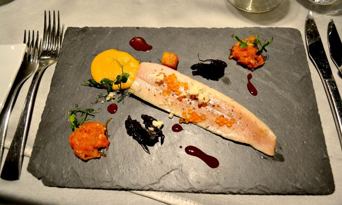 Pstruh „sous-vide“, dýně, stroček. Dýni tu najdete rovnou ve třech podobách – ty dvě hromádky jsou čatní, pak opečená kostička a navrch pyré. Na to, že nejsem dýňový fanda, milé chuťové překvapení. Stročky čerstvé (i když si nedokážu představit realizaci takových dodávek po celý listopad), podušené. Kapiová omáčka. Pstruh se dělal jen pár minut, ponechal si skvělou strukturu, jen ten pstruží kaviár je na rozdíl od jeseteřího poněkud křupavý až nerozkousatelný. Vzhledově se mi tenhle talíř líbil určitě nejvíc a chuťově bezvadně ladil.