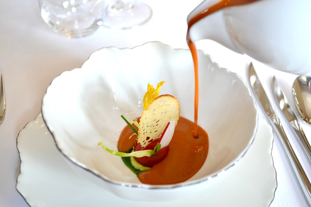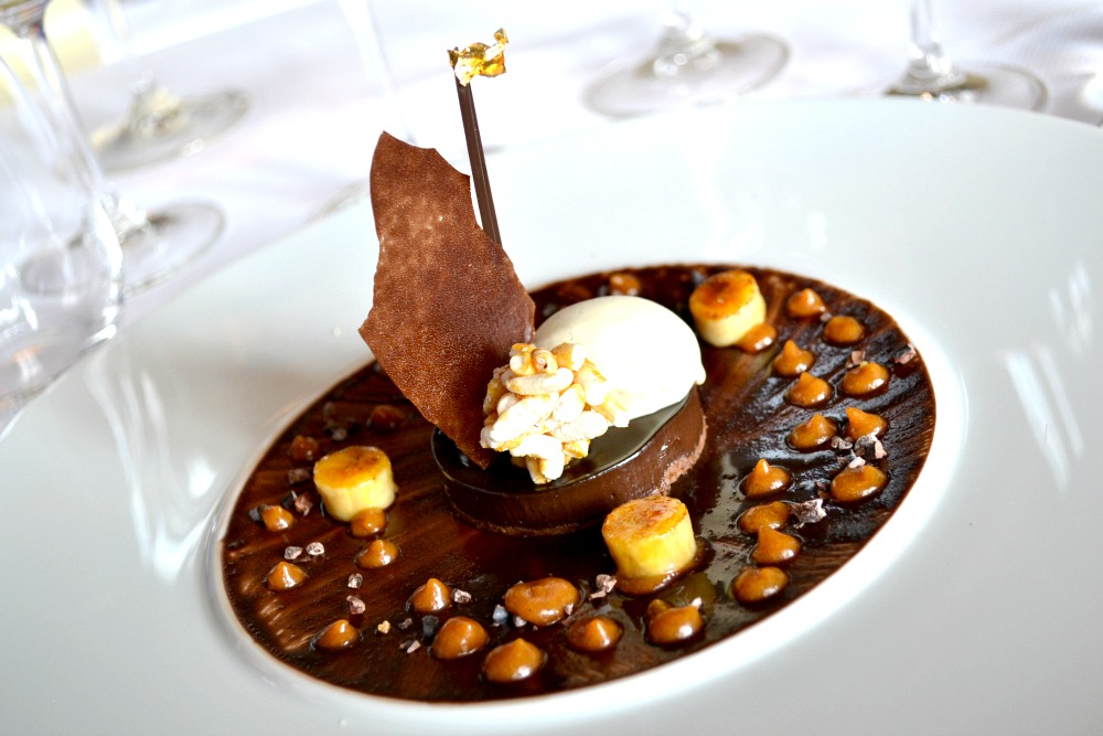 Cremeux z Valrhone čokolády „Araquani“. Foodbloger, který nemá rád sladké, je za blbce, vím to, ale já svým chutím neporučím. Ta vlaječka na čokostopce je pravé zlato, to jsem snědla, to by snědl každý, že :) Konzistence cremeux jemná, kompaktní, celistvá. Zhotovení musím pochválit, až na to, že se poněkud špatně vytírají ty čokorozmazávky na talíři. Pro milovníky čokochutí, kteří mají na dezert po jídle vždycky dostatek místa, dobrá volba. Jinak vidíte karamelové ťupky, trochu „popkornu“, kousky oříšků, banánové výřezky a zmrzku. Jo a ten obrázek lití oranžové tekutiny do misky nahoře, to je amuse-bouche – gazpacho.