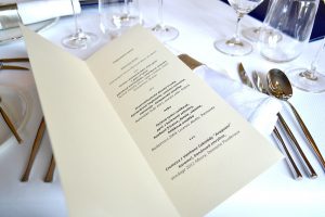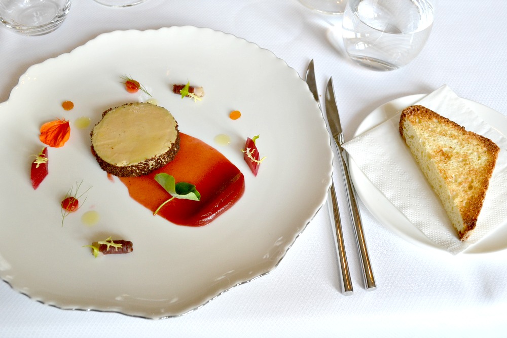 Terina z kachních jater Foie gras s pain d´épice, jahodová marmeláda, rebarbora, brioche. Lahodná chuť tučných jater nejjemnější konzistence, kombinace se sladkou jahodovou a nakyslou rebarborovou chutí nápaditá, porce teriny až dost velká, na to si ale moc lidí stěžovat nebude…