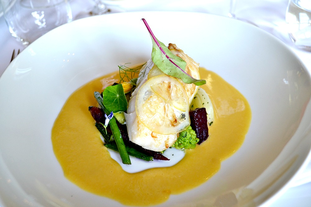 Severoatlantická divoká treska, koriandrové tagliatelle, sezónní zelenina, maracuja-šampaňská omáčka. Pro ty, kteří mají rádi kyselé a lehké pokrmy, je to skvělá volba. Ryba byla opravdu skvostně udělaná, bez omáčky by pokrm nedosáhl ani polovičního efektu, krásně barevná zelenina na skus, tohle mi sedlo.
