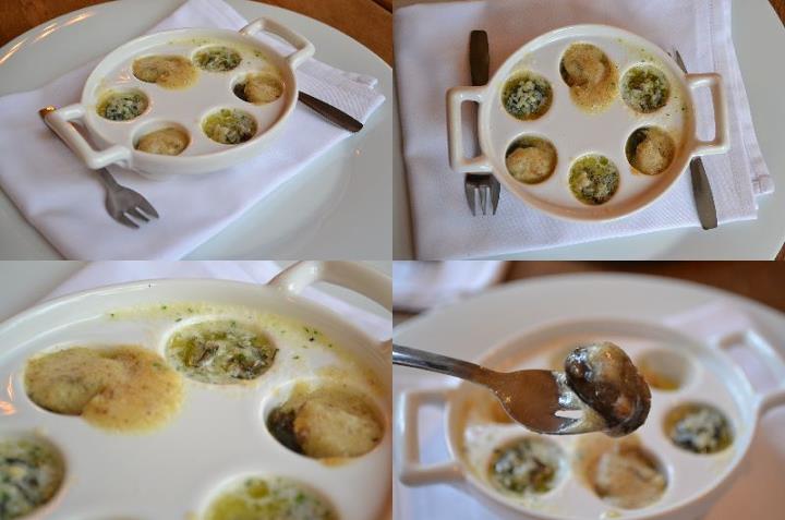 Další chod může být Tatarák z tuňáka ( SASHIMI KVALITA ) s rajčatovým concasé a rukolovým salátkem. I tady si možná osvěžíme slovníček. Concassé v originále psáno s dvěma „s“ je termín z francouzštiny, který znamená nasekanou, rozmačkanou nebo rozmixovanou základní surovinu. Většinou se jedná o zeleninu. Nejčastěji se tento termín používá u oloupaných rajčat, zbavených středu a tím semínek a nasekaných na velmi jemné kousky. Tuňák v sashimi kvalitě znamená, že je hoden i konzumace v syrovém stavu, pojaponsku tradičně na tenké plátky. Concassé příjemně okyselilo na hrubo nasekaného tuňáka promíchaného s cibulkou, k tomu rukola s balzamikem. Fajnovka. Nebo se vám může víc zalíbit 1 tuctu tradičním způsobem pečených šneků s bylinkovým a kaštanovým máslem. Šneci jsou původem z Česka, odtud se vozí do Francir, tam je správně zpracují, zamrazí a pošlou zpět sem – velmi logické a nenákladné…ale co se dá dělat. Šneci jsou bez ulity, potopené a zapečené v máslech s příchutěmi. Obě luxusní. Někdo si myslí, že je je maso hodně gumové, tyhle jsem ale nepřežvykovala dýl než dobře udělanou chobotnici.