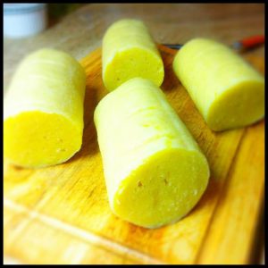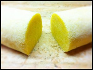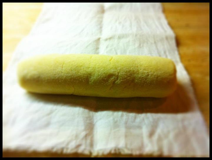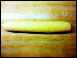 Pokud se vám lepí, na povrch ještě přidejte hrst hrubé mouky. Dlouhý válec o průměru cca 6 cm rozřízněte nožem na dva a dotvarujte průřezy