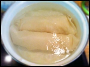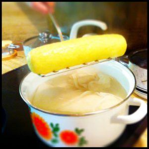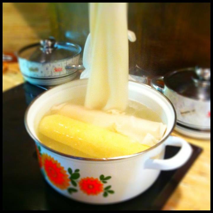 Po uplynutí doby vidličkou zatáhněte za plátno, rozbalte knedlík ještě ve vodě a klasickým „vyndavákem“ na knedlíky ho vyjměte.