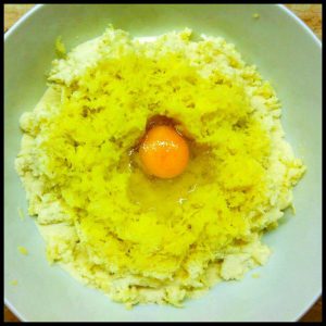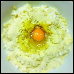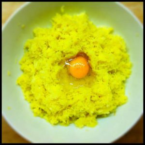 Přidejte i tak decku mouky. Píchněte prstem do žloutku a začněte kroužit o do brambor a vmíchávejte tímhle pohybem ingredience do hmoty.