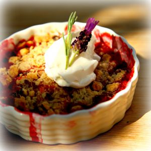 Z broskví odstraňte pecky a pokrájejte na asi centimetrové kostičky. Velké jahody překrájejte, malé nechte v celku. V rendlíku nechte broskve a jahody asi 2 minuty chuťově spojit s vínem/vodou, trochou vanilkového cukru a pokrájeným zázvorem. Připravte drobenku/žmolenku, uvedený poměr je jen orientační, zkrátka, v rukou se to musí drolit/žmolit. Do máslem vymazané nižší zapékací misky nejdřív umístěte vrstvu ovoce a pak zasypte drobenkou tak, aby barevná vrstva pod ní skoro nebyla vidět. Pečte na cca 190 °C po dobu 15 minut (do zezlátnutí povrchu) v troubě. Podávejte ještě teplé se zakysanou smetanou nebo crème fraîche.