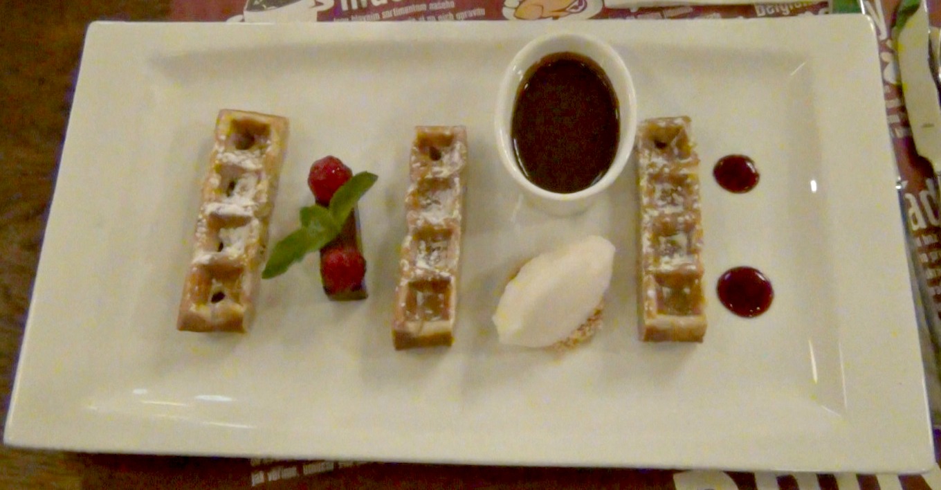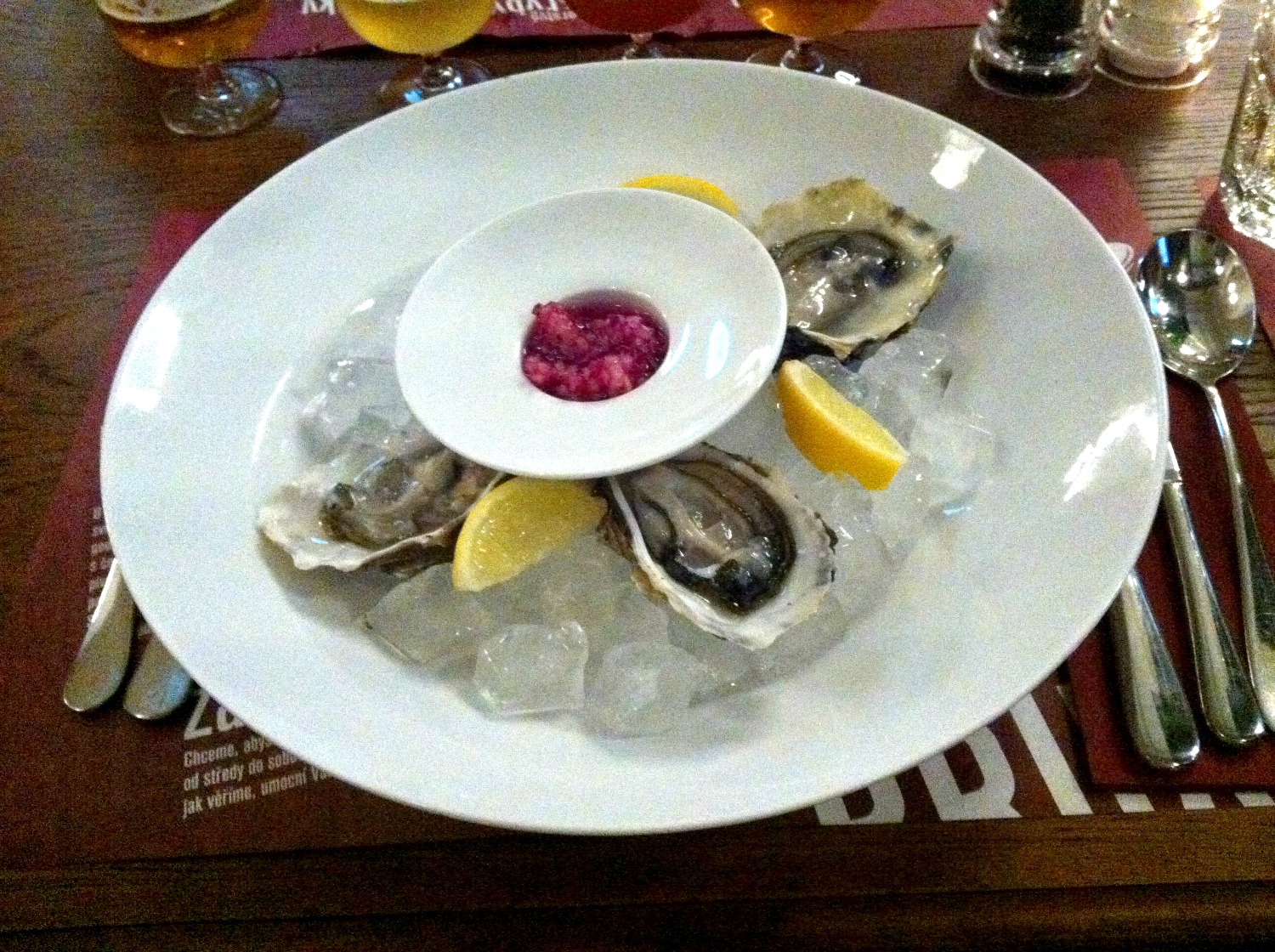 A ještě vafle s čokoládovým želé, malinami a sorbetem z pšeničného piva La Trappe Witte za 95 Kč. Najít v Praze místo, kde vám udělají pořádné nadýchané, horké obláčkové domácí vafle hustě polité sirupem, je stále jen utopií. Dezerty tu obecně lépe vypadají, než chutnají. Vafle byly studené a poněkud tužší, čokoládové želé příliš light, jakoby vodnaté, sorbet zajímavý, ale také dosti namixovaný s vodou, ze začátku cítíte jen ledovou tříšť, až na konci takový pivní dojezd. Prostě bych doporučila dát si tady místo dezertu spíš sýry… a nebo zase ústřice :-D.