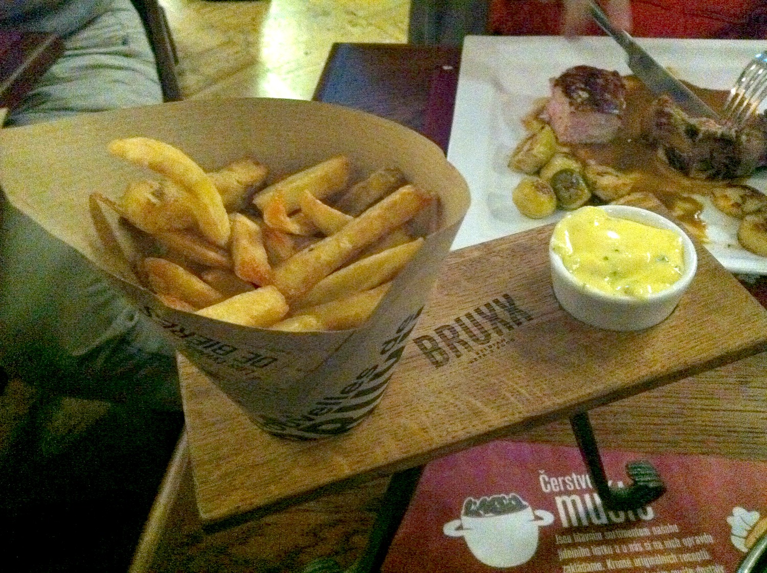 200g smažené belgické hranolky se podávají k mušlím za zvýhodněnou cenu 45 Kč, jinak samostatně stojí kornout hranolků s domácí majonézou 85 Kč. Obé o stupínek horší než v Les Moules. Pardon za to srovnání, ale tím okopčením všehomíra z téhle restaurace to považuji za nutné. Tady lze ale ocenit originalitu Bruxxu v rámci servírování v kornoutku a na stojánku.