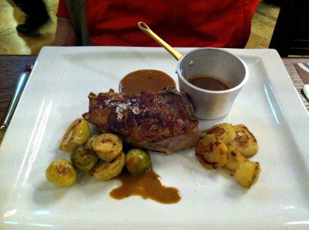 Grilovaná 300g vepřová kotleta připravená na dřevěném uhlí s omáčkou z belgické prémiové hořčice Grand Mère, podávaná s bruselskou růžičkovou kapustou a pečeným pastinákem za 259 Kč. Hořčičnou omáčku si můžete představit mnohem hořčičnější, než byla tady. Masa byla opravdová flákota, i když se celkem problematicky dostává ze spátů všech těch kostí, které na ní jsou. Pastinák supr, ale totální palec dolů za téměř nerozkousatelné kapustičky. Chápu, že rozblemcané převařené nejsou nic moc, je lepší, když křupou, ale že byste si na tom museli zrovna vylámat zuby? Ochutnala jsem jeden kousek a měla jsem hejble ho vyplivnout do omáčky k mušlím, kde by se ztratila v propadlišti dějin, kam rozhodně patřila.