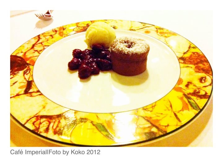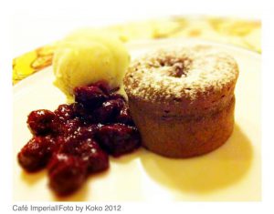 Čokoládový fondant s pistáciovou zmrzlinou a višněmi (147 Kč)