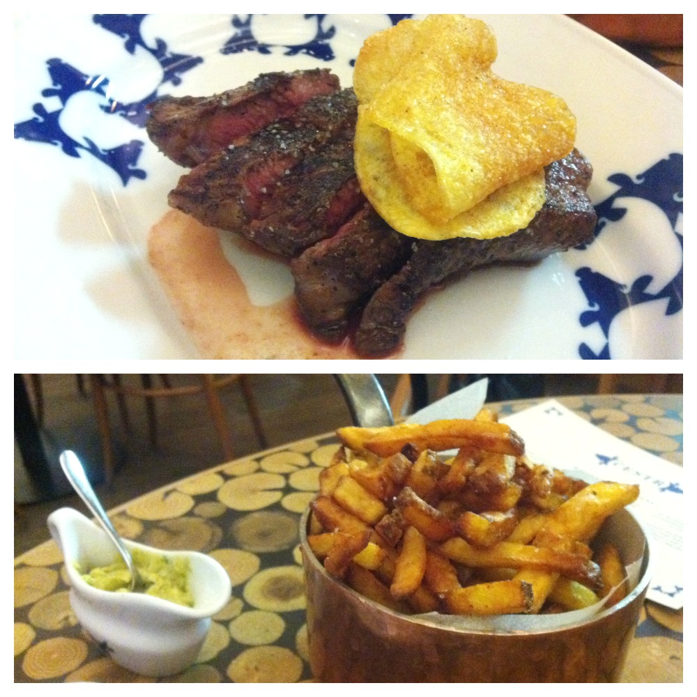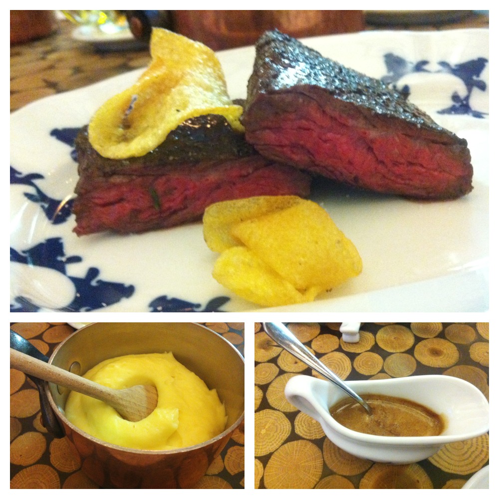 Květová špička (23) malá část spodního šálu s tukovým krytím (125 g) 255 Kč s domácími hranolky 58 Kč a bylinkovou omáčkou 39 Kč. Oproti oponce byla horší – ve smyslu méně chuťově výrazná a líbezná. Ale účelem bylo vyzkoušet něco, z čeho steak většinou člověk prostě na talíř nedostane. Mise splněna. Hranolek opět dosti předosti. Ale hlavně předosti opečené do troudovita. Uvítala bych tu domácí úpravu o něco kratší. A omáčka? Jaká omáčka? Bylinková? Bylinkové máslo! … to by bylo mnohem příhodnější… protože to prostě neteklo a muselo se to shrnout ze lžičky. Omáčky jsem tedy shledala nejslabšími články co se týče mých představ podle nápisu v menu a následné realizace. Jsem si ale vědoma, že tyto představy jsou pouze mé subjektivní.