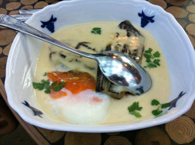 Grilovaný baklažán s vejcem – pečený a pak krátce ogrilovaný lilek, křenová omáčka, pošírované vejce 235 Kč. Opět má čirá zvědavost. A neskrývané překvapení z toho, jak jídlo vypadalo. Záplava křenovou omáčkou a pošírované vejce připomínalo spíš to třaslavé „vejce 63°C“, poslední dobou tak oblíbené v lepších restauracích. Tady jsem zaznamenala jednu slabou chvilku obsluhy, byl mi slíben ještě nahřátý talíř, abych z křenové potopy mohla tonoucího pana Lilka zachránit, ale talíř se nedostavil, a tak bylo nutno odchytit jiného člena obsluhy, aby pochybení napravil. Omáčka byla ale ve výsledku oproti své vizáži překvapivě lehká, a tak jsem si jí trochu spolu s vejcem nalila na vydobytý nahřátý talíř. Ale…ano, jsem si vědoma, že 235 Kč je i tak celkem dost. Vegetariánský pokrm mi dovolil se o to víc těšit na mou oponku.
