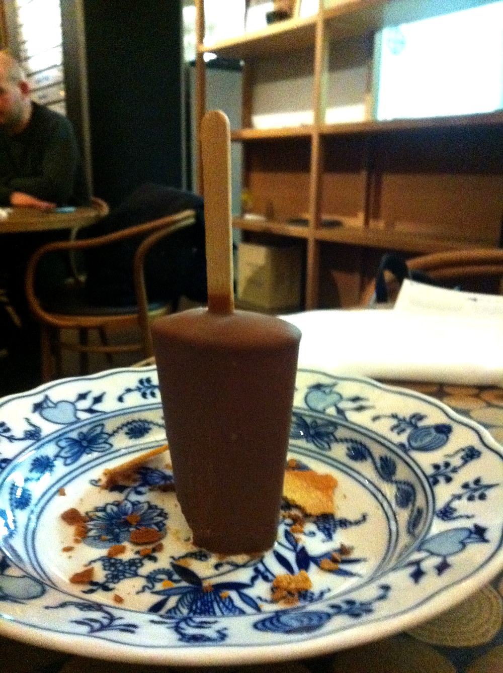 Ještě jednu položku jsem nemohla vynechat. Opět něco, co jsem jinde nikdy neviděla. Teda, na benzínce jo, ale ne v restauraci. Domácí nanuk z tvarohu a zakysané smetany, mléčná čokoláda 105 Kč. Milovník sladkého může namítnout, že by mohl být víc sladký. Ale jinak to byla vtipná a vskutku domácí frajeřinka. PS: normálně ho nakousnutý neservírují, ale já si uvědomila, že není vyfocený, až po prvním soustu :)