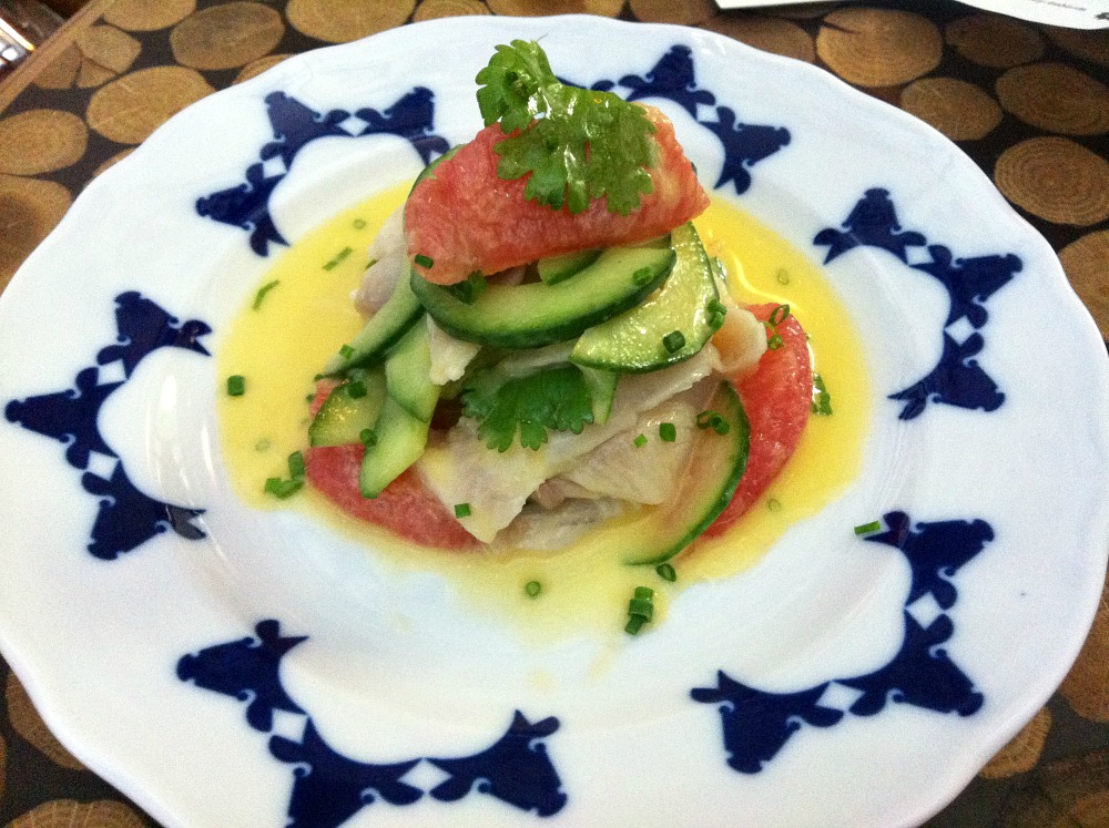 Ceviche ze pstruha – jemné plátky marinované v limetové šťávě, okurka, grapefruit, citrusový dresink 168 Kč. Chutné, svěží, opravdu čerstvé (jinak by mi o tom můj citlivý žaludek dal dnes ráno znatelně vědět). Z předkrmů tu určitě nejvíc frčí tatarák, jenže já mívám tendence restaurace zkoušet na těch zrádnějších položkách v menu. Ale příště, jako že příště ještě bude, si ho dám a poskytnu fotku a pár slov o něm :) Málokdo si troufne na sladkovodní rybu bez tepelné úpravy. Ceviche je syrová namarinovaná ryba, dělává se i z humrů, svatojakubek, krevet…ale ze pstruha jsem ho na jídelníčku viděla poprvé a nezklamal. K lehkému bílému skvělá volba. I když co na tom, že já k němu měla piváka :-D Místo koriandru bych tu byla spokojená i s koprem.