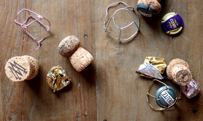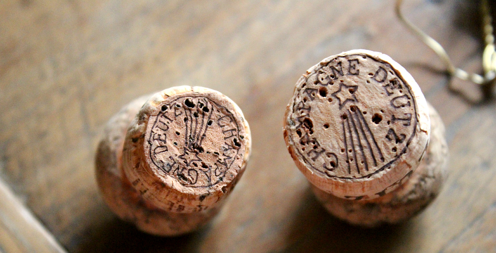 Všechna šampaňská se vyrábí jen jedenkrát za rok. Každé kvasí pak ještě v lahvi (minimálně 15 měsíců, ročníková 3 roky). Co jste možná netušili je skutečnost, že každý korkový špunt je na začátku pravidelný válec. Svůj charakteristický tvar dostane až tím, jak do narvou do lahve. Dole se pak roztáhne až po vytažení. Když se podíváte na fotku níž, rozdíl šířky dolní části korku taky něco znamená. Postupem času se korek totiž stahuje, takže ten nalevo si pobyl v lahvi o nějaký rok déle než ten napravo. Díky této vlastnosti postupem času, kdy je šumivé víno v lahvi, přichází o bublinky, protože špunt už tolik netěsní. Není to nijak zvlášť na škodu, nicméně i z toho se dá ledacos poznat a proto lidé své korky taky rádi zkoumají a obsluha jim je nechává na stole k dalšímu ohledání. A teď konečně k praxi, tedy k okamžiku těsně před otevřením a těsně po něm.