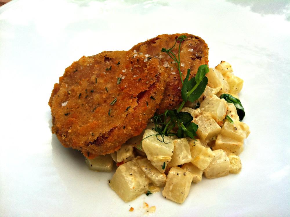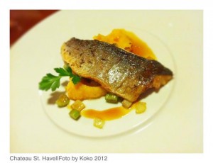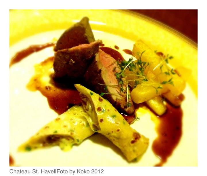 A je tu za mě stříbrná medaile – Řezy panenky z pyrenejského prasátka v provedení propečenosti jemně do růžova, na vláčné palačince plněné bylinkovým sýrem, tedy opět nezvyklou avšak překvapivě příhodnou přílohou, s hranolky bílé ředkve, které díky pošírování v šafránové várce vypadají skoro jako klasické bramborové