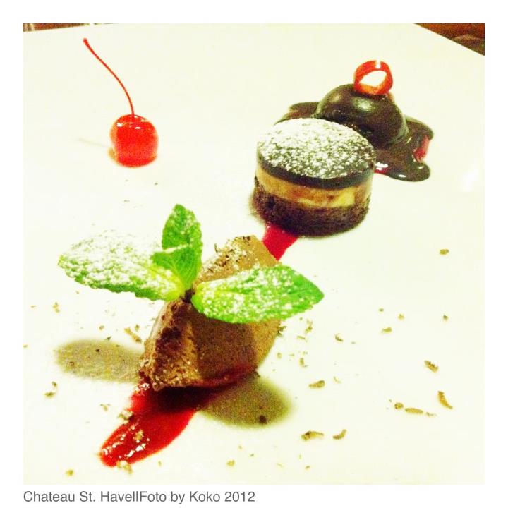noček kypré čokoládové pěny s višňovým coulis a kopeček zmrzliny z pravé belgické čokolády s koktejlovou třešní