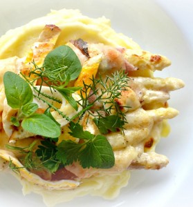 Stonky chřestu oloupejte a očistěte. Vymažte máslem pekáč nebo zapékací mísu a vysypte strouhankou. Šunku nakrájejte na asi 2 cm široké proužky a jednotlivě chřesty zabalujte a pokládejte vedle sebe do pekáčku. Posypte sýrem, ančovičky na kousky pokrájené posypte tu a tam, pak ještě také asi lžící strouhanky. Rozmístěte i kousky másla, osolte a opepřete a ke špičkám a koncům chřestů přilijte několik lžic smetany. Dejte zapékat na 180 °C, dokud povrch nezačne lehce zlátnout, do 18 minut by mělo být hotovo. Mezi tím vyšlehejte hedvábnou bramborovou kaši a z obou stran osmažte volské oko, pak překrájejete na nudličky. Servírujte s variací bylinek.