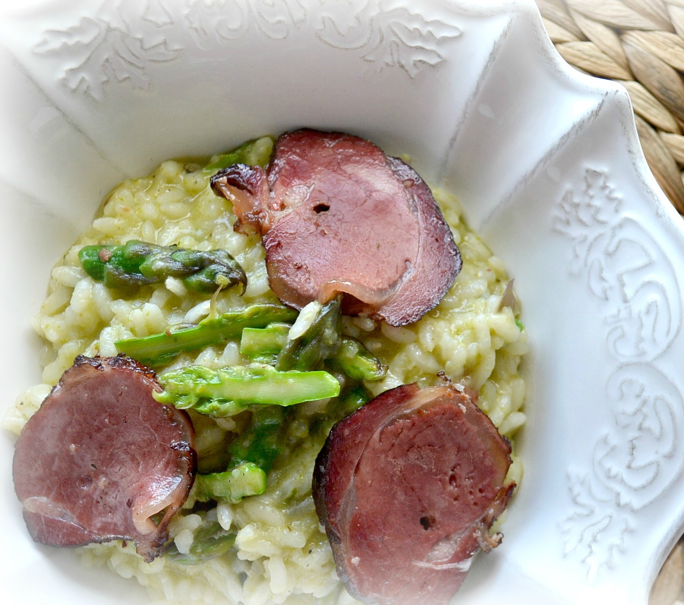 Pokud budete dělat vývar speciálně pro risotto, klidně použijte i nechtěné koncové části chřestů a pak další zeleninu, zejména cibuli, řapíkatý celer a petržel … s mrkví opatrně, je dost sladká. Postupujte principielně stejně jako když jsme dělali šafránové risotto k osso buccu. Nakonec však nepřidáváme máslo a parmazán. Místo toho asi 4 minuty před dokončením risotta přimíchejte pesto a také špičky chřestu, které se stačí dokřupava udělat. Doma by neměli takovou radost, kdyby to alespoň malinko nevonělo masem, na fotce vidíte plátek orestované vepřové kýty, lze přidat slaninu, šunku… také dělat risotto jako přílohu ke kuřecímu masu nebo bifteku… to už nechám na vás. Skvělé je prostě i jen samo o sobě.
