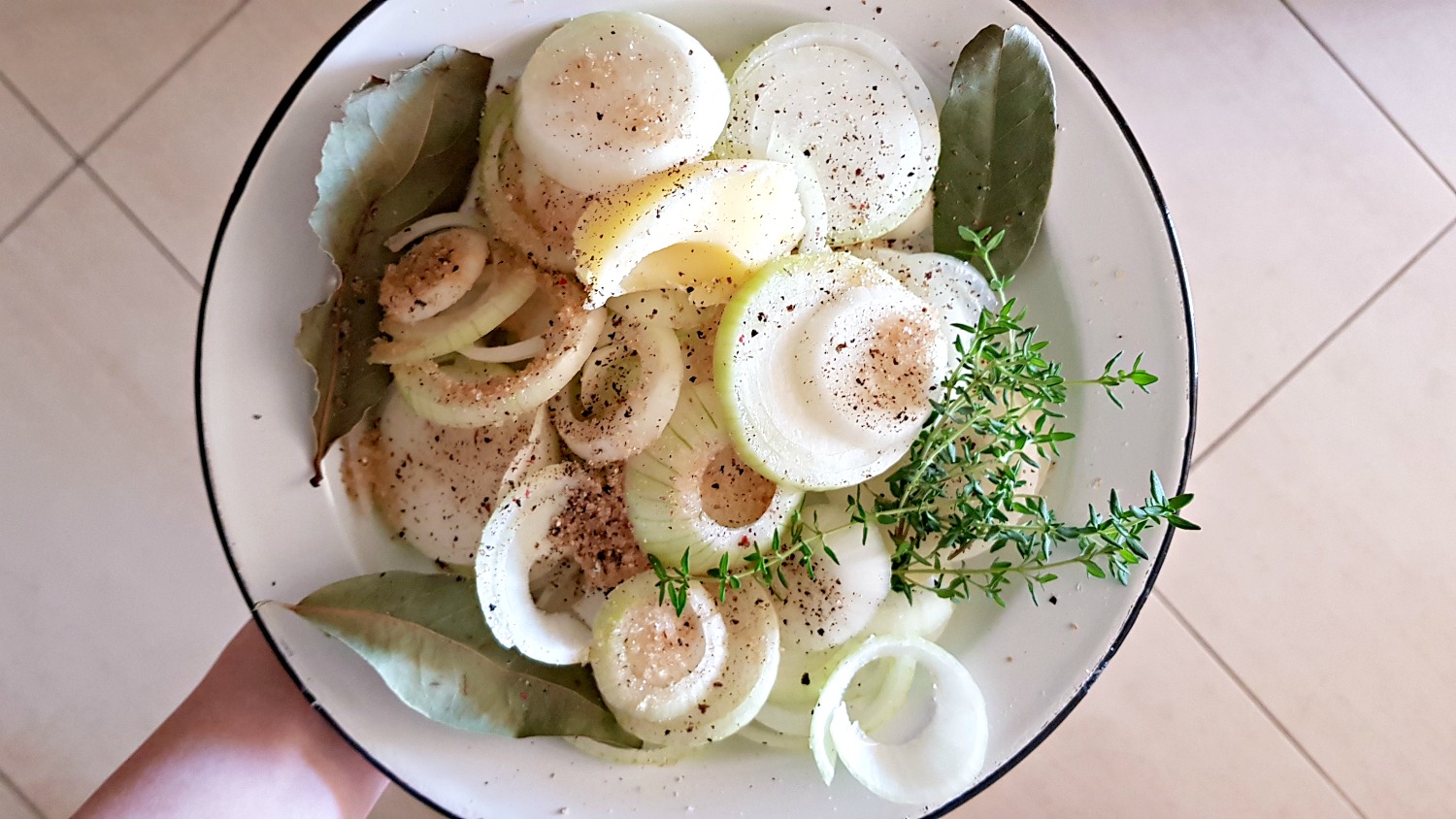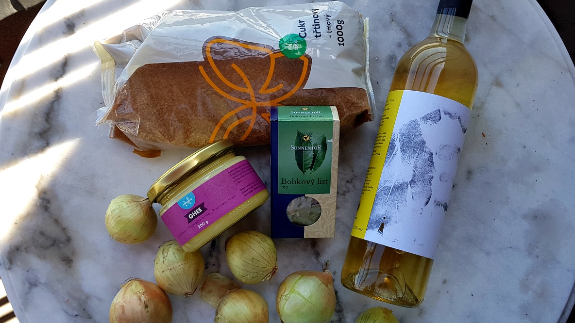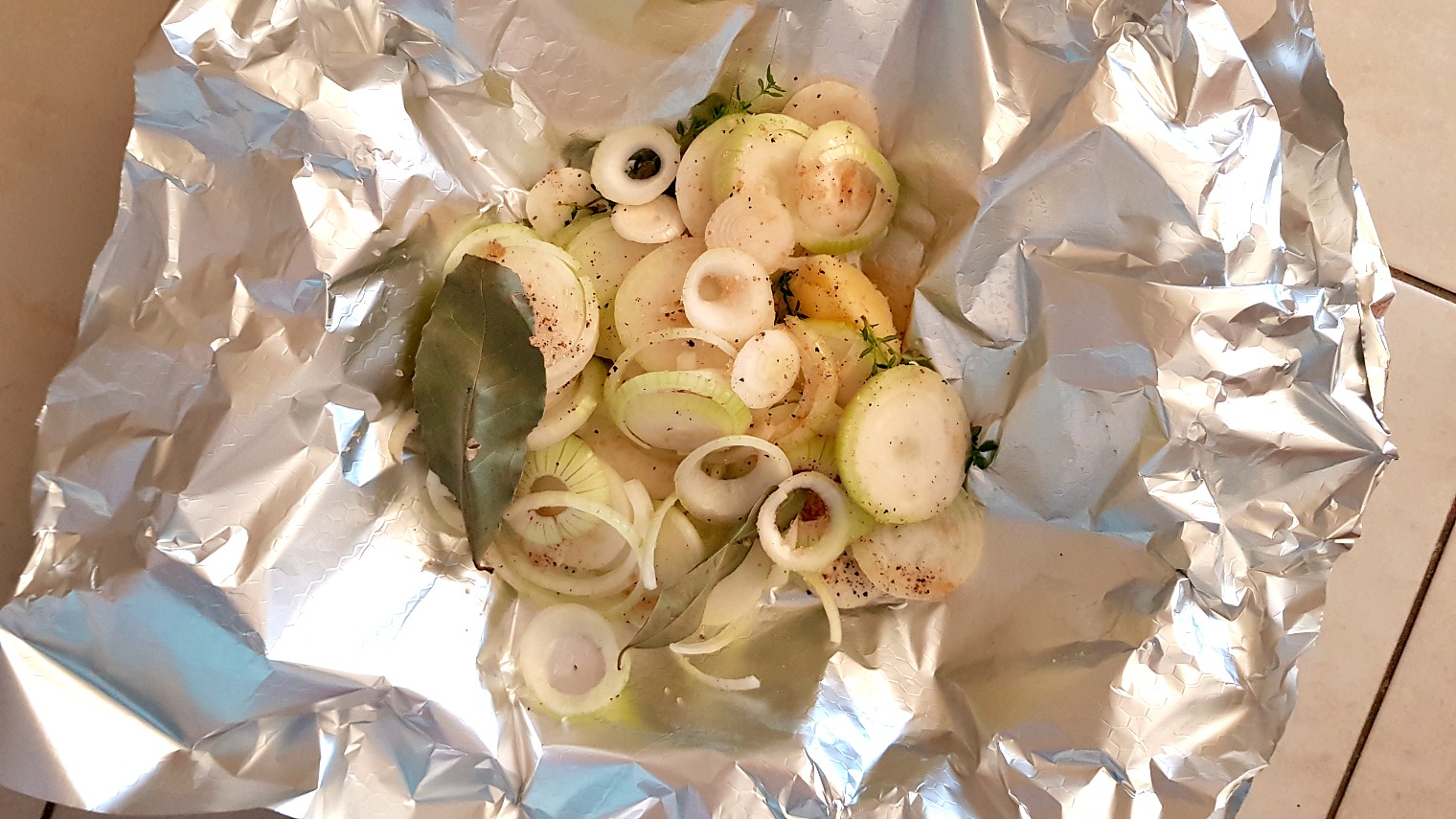 Smíchejte cibuli s cukrem, asi tak lžičkou soli, mletým pepřem, bobkovými listy a tymiánem. Připravte si alobal. Já ho obvykle pomažu trochou oleje, pro jistotu, ale není to podmínkou. Pod cibuli totiž ještě přidávám ghí (přepuštěné máslo). Jeho výhoda je v tom, že ať bude gril rozžhavený sebevíc, nikdy se nebude přepalovat jako obyčejné máslo. Navíc dá úžasnou chuť cibuli.