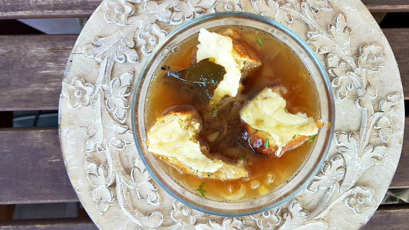 Správně jste si všimli, že do téhle cibulačky nepřidávám nikde mouku na zahuštění. Je to tak schválně. V létě nepotřebujeme příliš hutné polévky a přeci jen si myslím, že nasáklá bagetka tady bohatě postačí.