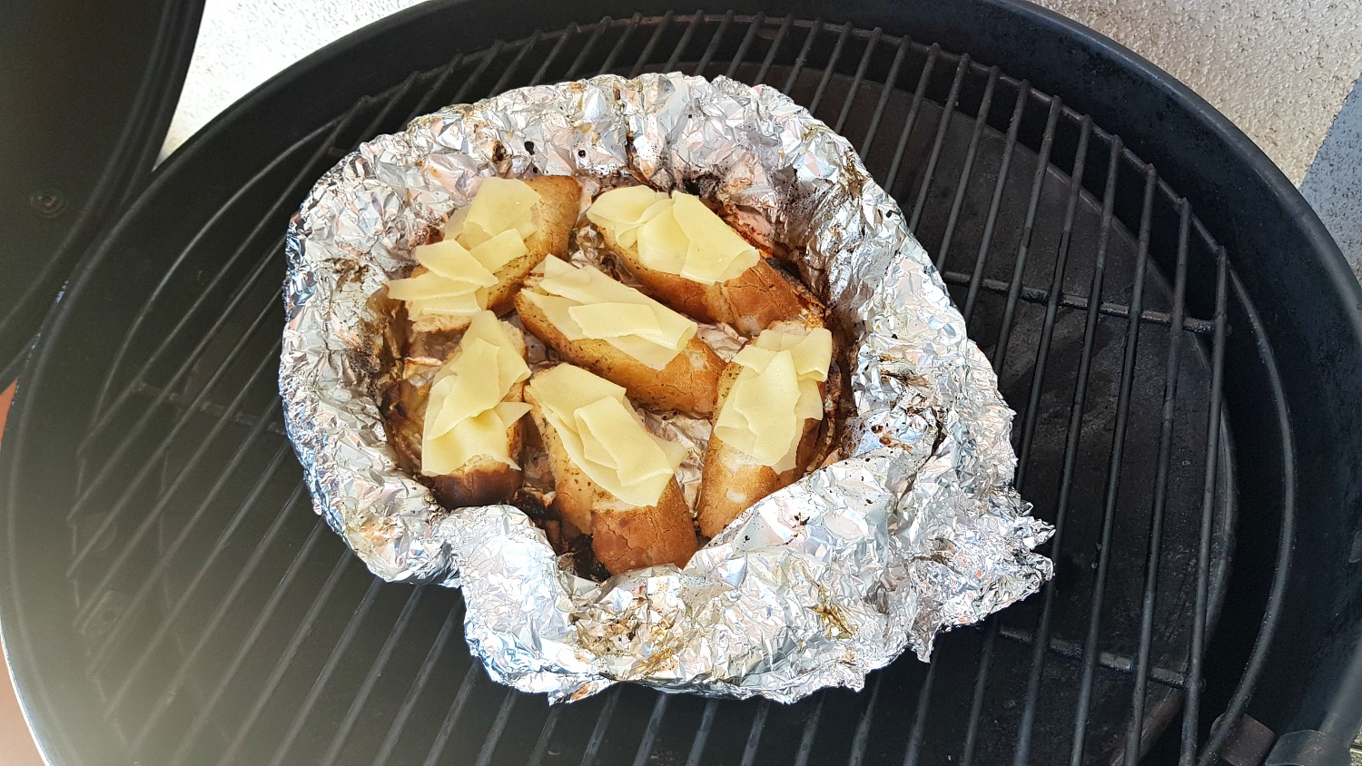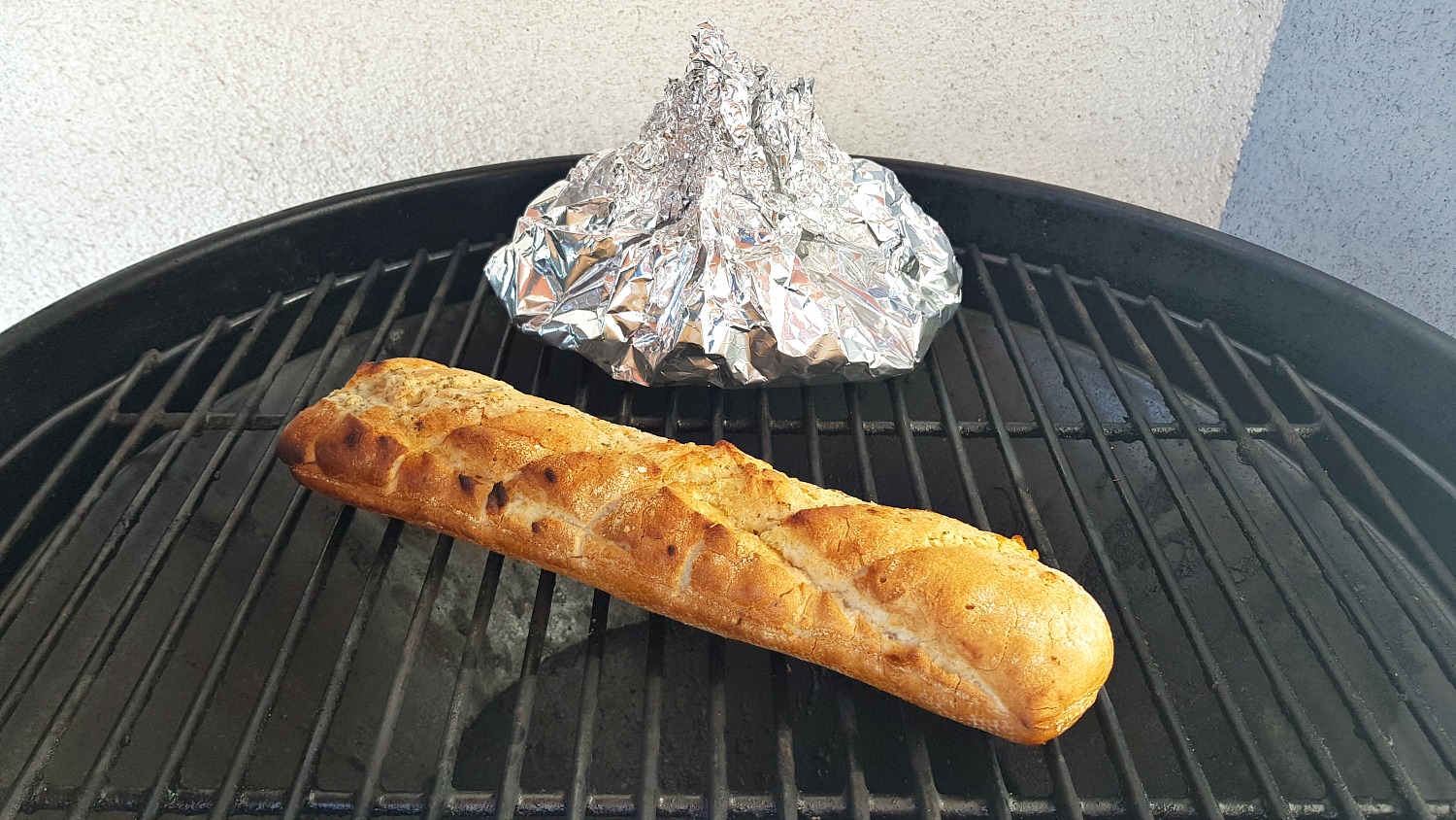 Když vám vedle vznikne prostor, dejte sem dopéct také bagetu. Ta bývá hotová do deseti minut. Nezapomeňte, že plátky bagety budeme pak ještě zapékat se sýrem, takže se na gril na chvíli ještě vrátí. Proto z ní nechceme udělat čertíka hned napoprvé. Hlídejte ji. Po patnácti minutách balíček rozevřete a vytvořte už jen otevřenou misku. Promíchejte cibulový obsah a snažte se bobkové listy zastrčit pod cibuli pěkně tam dolů do tekutiny, ať se nespálí. Jsou k tomu nejnáchylnější z celého vnitřního obsahu.