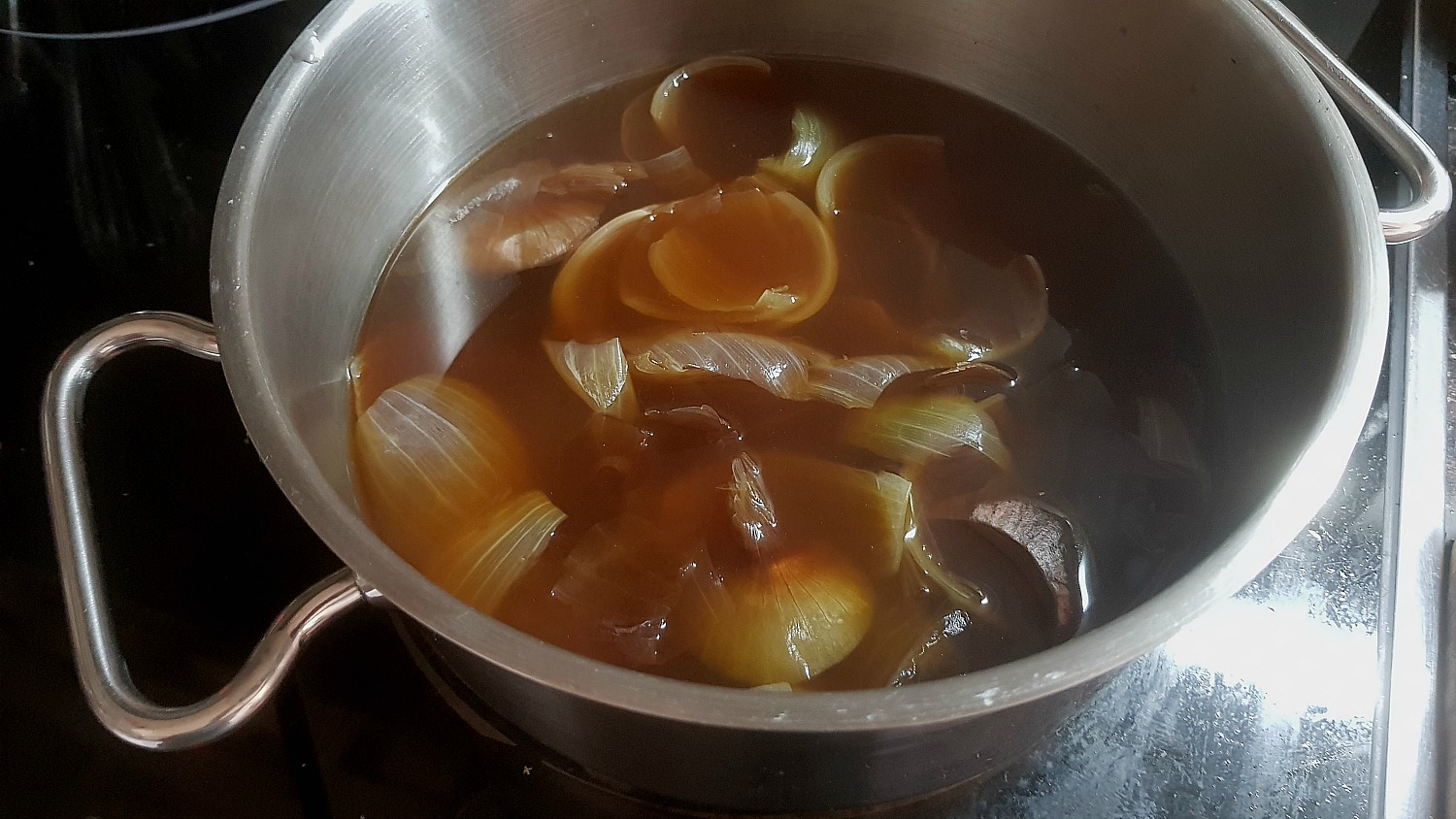 A teď zpět k pěkným slupkám, které jsme odstranili při loupání. Ve vývaru je nechte alespoň dvacet minut provařit. Dají další cibulovou chuť. Pak slijte a vymačkejte z nich zbývající tekutinu, ať nic nepřijde nazmar. Do té doby už bude cibule na grilu chytat medovou barvu.