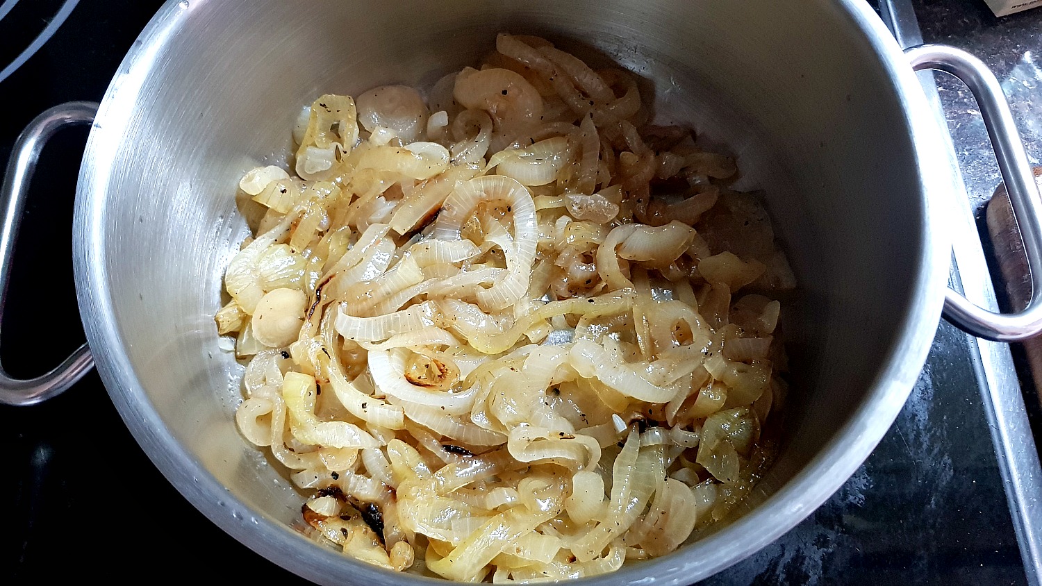 Tady jen dávejte pozor, ať se nějak zásadně nespálí. Cibulačka by byla hořká, kdybyste do ní dali cibuli spálenou na troud. Že je hotová, poznáte tak, že se tekutina vyvaří a plátky budou měkké a poddajné.