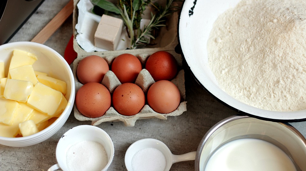 Bez robota vám pečení domácí briošky příliš doporučit nemůžu. Samozřejmě, že to teoreticky lze, ale pak radím jen poloviční množství těsta. Potřebuje tak dlouho propracovávat a je tak hutné a táhlé, že se ten čas nad tím strávený a energie vydaná dají považovat za sportovní výkon vrcholového charakteru. Pamatujte na to, že všechny ingredience by měly mít pokojovou teplotu, což znamená, že je je vyndáte z lednice na několik hodin předem. Hlavně u másla a vajec je to důležité. Mléko malinko přihřejte, aby bylo lehce vlažné. Mouku zkuste sehnat pekařskou hladkou 00, tedy s vysokým obsahem lepku – někdy je označena také jako na pizzu. Co se týče vajec, budete do těsta potřebovat 5 opravdu velkých a nebo, máte-li malá, použijte jich 6, před vlitím do robota je v misce rozkvedlejte a tak půl vajíčka si odlijte stranou do hrníčku (pak využijete na pomazávání spolu s mlékem). Já používám čerstvé bylinky, které můžete bez problému vynechat. Pokud briošku chcete používat vlastně na sladko, není problém. Nechte poměr cukru a soli stejný, bylinky vytěsněte z mysli a zapracujte do něho třeba nasekaté ořechy, ořechy v čokoládě, nakrájené sušené ovoce a podobně.