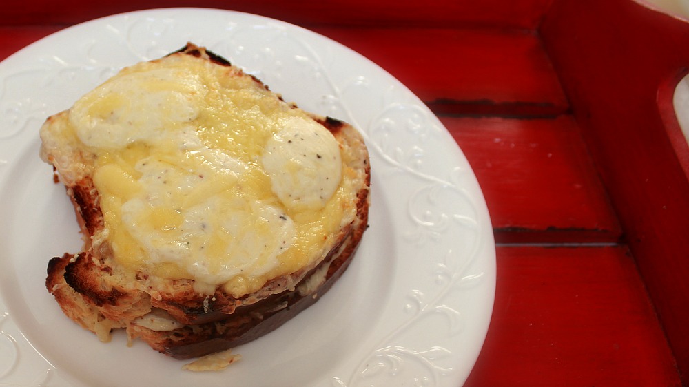 Máme briošku (a nebo toastový chléb). Máme bešamel. Takže teď zbytek Croque Monsieur. Nastrouháme si sýr a připravíme a šunku. Teď je to totální hračka. Minimálně centimetr široké krajíce briošky opečte nasucho na pánvi z obou stran na nižším stupni ohřevu. Máslo uvnitř se uvolní, není třeba pomazávat. Jestliže máte toastový chléb, trochou másla ho pomazat před tím můžete. Na dolní krajíc patří vždy tak lžíce a půl bešamelu rozetřeného až pěkně do stran. Pořádný plátek šunky a asi 3 dkg strouhaného sýra. Přiklopíte druhým plátkem. Opět stejně bešamelu a na něj sýra už o něco méně. Zapečte pod grilem v troubě. Okraje horního krajíce nenechávejte moc obnažené, ideálně ať je bešamel úplně všude, ať se vám malinko nepřichytí jako ty moje na fotce výš. Pod grilem na 220 °C trvá zapečení asi 3 – 4 minuty, ale prostě čekejte na tu správnou barvu.