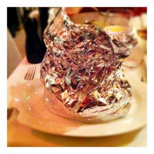 Amouse bouche chutnala mnohem líp než vypadala. Z jaké ryby byla, netuším, když nám jí tenhle chytrák servíroval, tvrdil, že je to tuňák, když sklízel, ptal se, jestli ta treska byla v pořádku. Následovala Toskánská zeleninová polévka (140 Kč). Chuťově supr, vzhledem žádný zázrak a konzistenčně v ní stála lžíce… až moc. Následovalo překvapení v pytli z alobalu.