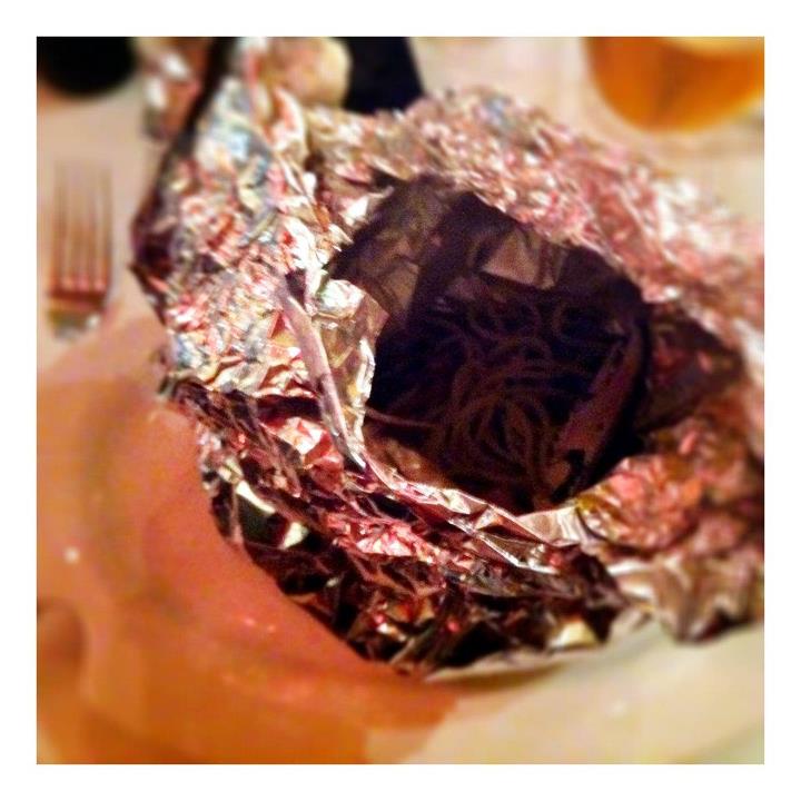 Spaghetti s mixem mořských plodů v alobalu (380 Kč). Čekala jsem skvělé chlazené těstoviny, místo toho dostala průměr