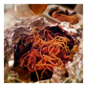 z a lá italské restaurace na rohu. Mořských plodů tam bylo opravdu moře ( kreveta, chobotnice, chobotničky, sepie, vongole a slávky) – celé moře z nich vypuštěné tekutiny jsem ale našla u dna pytle a to zas až tak fajn už nebylo. K tomu dvě cherry rajčátka. Chuť všech plodů byla vlastně stejná. Tohle jídlo bych nikomu nedoporučovala.