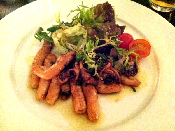 Nicméně krom stálé nabídky na jídelním lístku tu měli i 4 speciality dne z čerstvých surovin. Nikde je nemáte napsané, nikde se nedovíte, kolik stojí. Obsluha vám je odříká jako básničku i s vysvětlivkami. Já chápu, že někdo nemusí tušit, co to znamená panna cotta a podobně, ale ten, kdo to tuší, sedí a je mu trapné obsluhu v básničce přerušovat, aby neztratila nit. Jenže poslouchat to je pruda, po minutě nevíte, kam se koukat, pohledy do očí začínají být vyčerpávající, ze souhlasného pokyvování, že stále receptorujete výčet, už vás bolí krk… a on tam stojí a pořád povídá. Přistihnete se, že už nevíte, co bylo to první jídlo… Zkrátka vytištěná denní nabídka by byla fajné. Navíc není úplně v pořádku, co byl přednes ukončen číšníkem, nerudná servíra přinesla vodu a pivo (naštvalo jí, že si nedáme víno) a začala jet tu samou básničku od začátku. Na to jsem neměla, takže jsem ji zastavila u třetího slova s tím, že její kolega nám to celé právě před půl minutou odříkal a že víme. Leč jsme nevěděli…všechno už jsme si nepamatovali :-D Jen to, co jsme si z toho možná chtěli dát – kalamáry a panna cottu…a taky že jo.