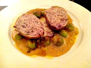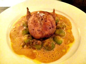 dále Grilované kalamáry se salátkem 290,- . Některé výtky k salátům v Ano, šéfe by se daly uplatnit i tady. Pokrm by se dal asi i líp naservírovat. A kalamáry by mohly být víc ogrilované… Vždycky by se něco našlo, kdyby se hledalo. Co do zpracování byla ale opravdovým majstrštykem Plněná křepelka s kapustovým ragu a krémovou omáčkou – 475,- . Vykostit tuhle mršku je umění a sama jsem se o tom přesvědčila ve svém videoreceptu. Zkoumáte-li náplň, byla to vlastně křepelka plněná křepelkou. Doufala jsem v nějaké překvapení, jako když si člověk koupí kinder vajíčko a je napnutý, co bude uvnitř… tak tady byla uvnitř další dvoubarevná čokoláda místo hračky. Kapustičky byly opravdu jen bleskově zblanšírovené, tedy natolik na skus, že nebylo jednoduché je v místě košťálu skousknout. Nějakou malinkou nepatrnou příložku ve formě jediného brambůrku bych pohledala… Klidně bych přitom směnila za nějakou kapustičku. Krémová omáčka silná, zřejmě na základu skeletů z křepelek a nějakého alkoholu. A zase ten olivový olej. Pro mne zde absolutně postradatelný ba až nechtěný.