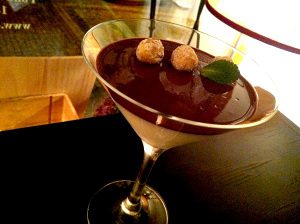 Už bez oliváče naštěstí byla Limetková panna cotta s čokoládovým želé 160,- . Servírování ve skleničce mi nedovolilo zkontrolovat stupeň třaslavosti, ale panna cotta byla skvělá, v žebříčku hned na druhém místě po telecím. Vyvážená chuť a místo třešínky na dortu tři makadamové ořechy. Skvělé.