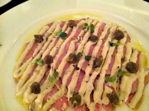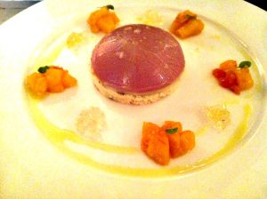 Tak že by konečně jídlo? Ano! Na začátek dva předkrmy : Telecí kýta s omáčkou z tuňáka – 235,-, která mi chutnala nejvíc z toho všeho, co jsem tu ten večer okusila. Úžasně vláčné a růžové telecí v osvědčené kombinace s tonnatou, jíž nikdo nešetřil, a to je dobře. Už na první pokrmu je znát, že restaurace si nezakládá na převratném dekorativním foodstylingu jako spíše na kvalitních surovinách. Techniky zpracování surovin a pokrmů jsou tu na jedničku. Vidět je to i na další Kuřecí paštice s vinným želé a hruškovým kompotem se šafránem – 235,-, perfektně vyklopená bábovička je toho důkazem. Leč chuťově byla paštika tak jemná, až skoro nevýrazná a mdlejší. Chybělo mi k tomu pečivo bez příchuti. K hruškám a želé jsem neměla chuť na vyvoněnou domácí mocně rozmarýnovou foccaciu, kterou neruda k předkrmům přinesla a která by svým aromatem naprosto paštiku přebila. A to kolečko toustíku pod ní jaksi nepostačí. Jinak struktura paštiky precizní, želé s hruškami k ní fajnově sedlo. O tom žádná. Olivový olej bych klidně oželela.