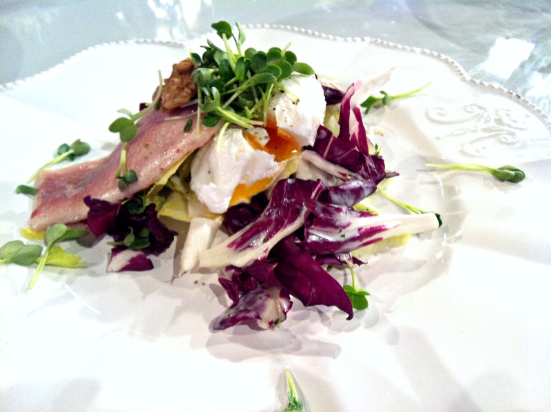 Čekanky natrháme na menší kousky. Celer nakrájíme na kousky. Ořechy vyloupeme a pokrájíme. Připravíme zastřená vejce. Jak na to, se podívejte v tomto videu. Na zálivku stačí všechny ingredience vložit do mixovací nádoby a rozmixovat ponorným mixérem. Salát promícháme se zálivkou a servírujeme se zastřeným vejcem, uzeným pstruhem a pečivem.