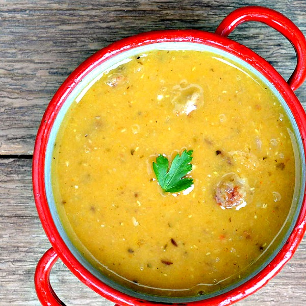 Nakrájíme si nadrobno cibuli, oloupanou bramboru, slaninu a řapíkatý celer. Pěkně dozlatova osmahneme na másle. Ideálně v hrnci s nepřilnavým povrchem. Poté zalijeme horkým vývarem. Přivedeme k varu. Vsypeme čočku a necháme asi 10-13 minut vařit. Rozmixujeme ponorným mixérem. Vrátíme na plotýnku. Zelí překrájíme na krátké (1-2 cm dlouhé) kousky. Přidáme ho do polévky, stejně tak i nálev. Přidáme všechno koření a necháme minimálně ještě 15 minut provařovat, zkrátka dokud zelí nebude měkké. Klobásky pokrájejte na centimetr dlouhé válečky a na minimu másla je osmahneme dohněda vedle na pánvičce. Přidáme do hrnce. Pár minut ještě vaříme, dochutíme, aby byla polévka silná a poctivá – možná potřebuje víc zelí nebo alespoň láku, chilli, kmínu, soli, pepře? Bylinek? Papriky? Ochutnávejte a dolazujte. Tahle polévka je nejlepší proleželá druhý den, takže ji dělejte klidně dopředu. Jen klobásky radím opéct a přidat až před podáváním. Záleží na vašem vkusu – jestliže je pro vás polévka příliš řídká, přidejte další čočku a vařte dalších 15 min (mixovat už nemusíte) a jestliže je moc hustá, stačí zředit vodou nebo vývarem a provařit pár minut.