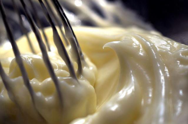 Do čisté vytřené porcelánové mísy s kulatým dnem vložíme žloutky dokonale zbavené bílků. Žloutky trochu posolíme a rozetřeme drátěnou metlou. Ze začátku stále jen opatrně přikapáváme olej. Když nám hmota začíná houstnout přiléváme olej v tenkém praménku za stálého tření metlou tak dlouho, až směs zhoustne, to jest až se hustá hmota zachytí kolem metly a utvoří se jakýsi knedlík. Tuto hmotu rozředíme citronovou šťávou nebo octem a opět za stálého míchání přiléváme tenkým praménkem olej tak dlouho, až nám hmota podruhé tak zhoustne, že zůstane nabalená na metle.