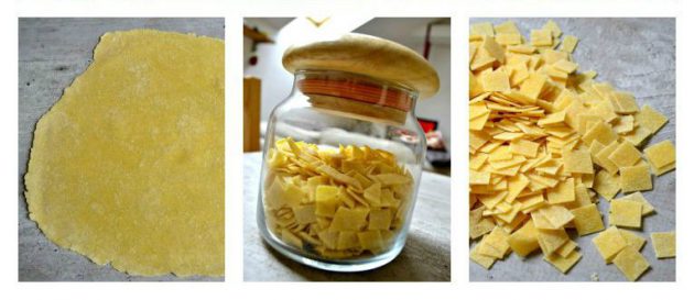 Další informace skoro nejsou třeba. Odkrojky z krajů placky nakrájejte na krátké tenké nudličky a použijte je do polévky. Stačí je nechat pořádně prosušit, až se při stisku samy zlomí a uchovat v uzavíratelné dóze. Stejně tak to musí být i s flíčky, které takto chcete skladovat. U těsta je nejdůležitější ho propracovávat tak 5 minut, aby se vše opravdu spojilo a pak dobře válelo. Stačí ho nechat tak 10 minut odpočinout a můžete začít. Válíme za pomoci polohrubé mouky a snažíme se dosáhnout kruhovitého tvaru placky. Válení jedné placky z jednoho vejce trvá taky tak 5 minut. A chce to pořádně zatlačit. Pokud děláte šunkofleků víc, těsto si rozdělte na stejný počet částí, jako jste dali vajec. Nebude to taková makačka. Placky schnou nejlépe v létě venku na slunci a v zimě jim můžete pomoci klasickým fénem na vlasy. Jinak v teplé místnosti čekejte, že budou chtít schnout cca 30 – 50 minut. Nedoporučuju je krájet hned po uválení, protože by se na sebe jednotlivé vrstvy těsta začaly lepit. Těsto by mělo být silné 1-2 mm.