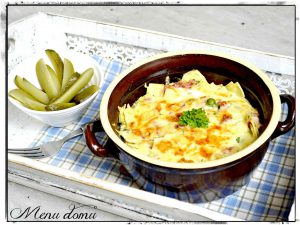 Jako masovou složku použijte to, co Vám nejvíc chutná. Nedoporučuju ale dušenou šunku s vysokým obsahem vody, tu neorestujete. Když už, tak třeba pražskou, od kosti, a nebo moravské uzené, kladenskou pečeni, debrecínku… jak je libo. Nakrájejte na o něco menší kousky než flíčky. Pokud máte možnost použít čerstvý hrášek, neváhejte. Máslem nešetřit. Vodu na flíčky dost osolte, do těsta totiž babička sůl nedávala. Ale pak to ještě dolaďte na pánvi. Petrželku nadrobno. A klidně větší než malé množství. A pak už jen vymazat pekáček nebo zapékací misky máslem a flíčky zalít vajíčkem rozkvrdlaným v mléce. Posypat sýrem a dát do trouby na 170-180 °C na cca 30 minut. Ke konci, pokud bude povrch bledý, chvilku na gril. Jestli je hmota uvnitř zapečená zjistíte hned jak odtáhnete flíčky od kraje, pokud uvidíte ještě tekuté mléko, chce to vrátit do trouby a dopéct už na vyšší teplotu. Někomu možná bude chutnat více zapékací tekutina ze dvou vajec a méně mléka,