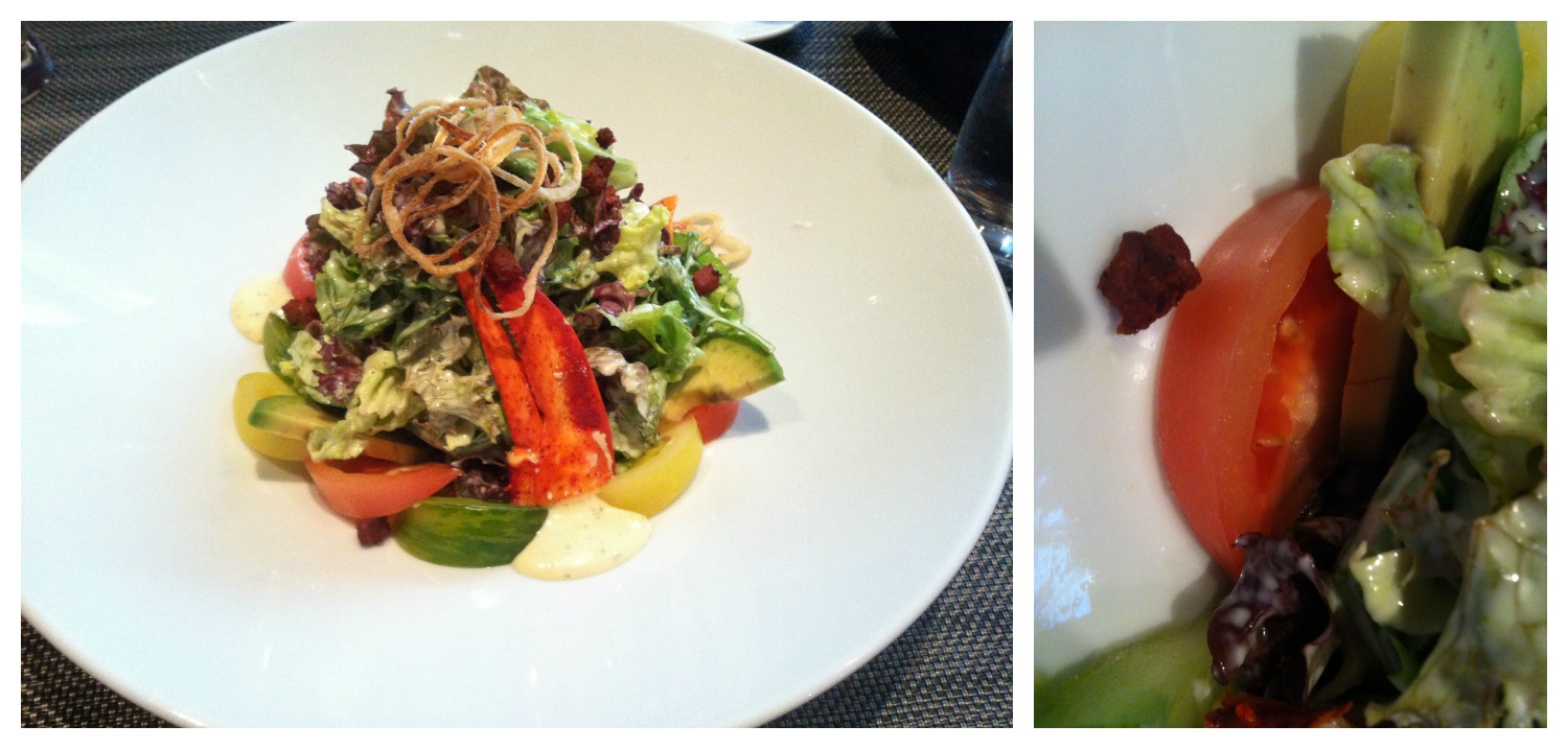 Pak tu máme SALÁT S HUMREM PODLE GEORGA – míchané baby listy, pošírovaný humr, uzená slanina, avokádo, heirloom rajčata, domácí krémový ranč dresink – 385 Kč. Teď jsem si vygéglila ta heroická rajčata – nečekejte speciální odrůdu, takto mohou být označovány nejrůznější typy, jde o to, že jsou z nějakých původnějších odrůd, nejsou to hybridi, a jsou odolnější vůči škůdcům. Študuju to proto, že to červené rajče, co jsem dostala na talíř, nemělo s hrdinstvím ani unikátním dědictvím flóry zhola nic společného. Představte si chuť oranžového moučnatého rajčete z Polska, prodávaného za pár kaček za kilo v supermarketu teď po zimě. Chuť není žádná. Jen ta blitká hmota. No – a to je přesně ono. Vedle u Vietvíků ve večerce mají tisíckrát lepší rajčata, než bylo tohle. Ale mně ho dali k humrovi. A to mě vytočilo. Po baby listech ani památky. Ten lolo salát měl možná depresi, že roste a stárne, a tak přesvědčil kuchaře, který baby salát nikdy neviděl, že je vlastně ještě nějaká týnka. Jinak si to nedokážu vysvětlit. Zadresinkováno až na půdu, můj detox utrpěl. Ale nesežerte to už jenom z principu, když to stojí 385 korun, že. Humr tam byl. Jedno nepopiratelně baby-klepítko. A poslední stížnost míří na „uzenou slaninu”. Jestli se vám kýve zub a nechcete do ordinace, tak jděte na tenhle salát. Přestože byly ty škvarky tvrdé, tak ale nekřupaly, naopak, stihly se zároveň vyznačovat i gumovitostí. A to je teda už ultra co říct. Vyplatilo by se je nedělat den dva dopředu, ale čerstvé.