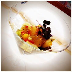 Přítomno bylo ale více šéfkuchařů ze zúčastněných restaurací. Co mi vlastně vůbec nechutnalo, to byla „Ceviche mušle sv. Jakuba (čerstvé mušle sv. Jakuba s červenou a žlutou paprikou, čerstvé mango a zálivka z limetky, zázvoru a soji)“ z restaurace U Emy Destinnové. Kombinace sladkého manga, čerstvých masitých paprik a syrové mušle bohužel bez dostatku limetky v zálivce, takže bez nakyslejšího dochucení, mě donutila sklenku s obsahem zas odložit.