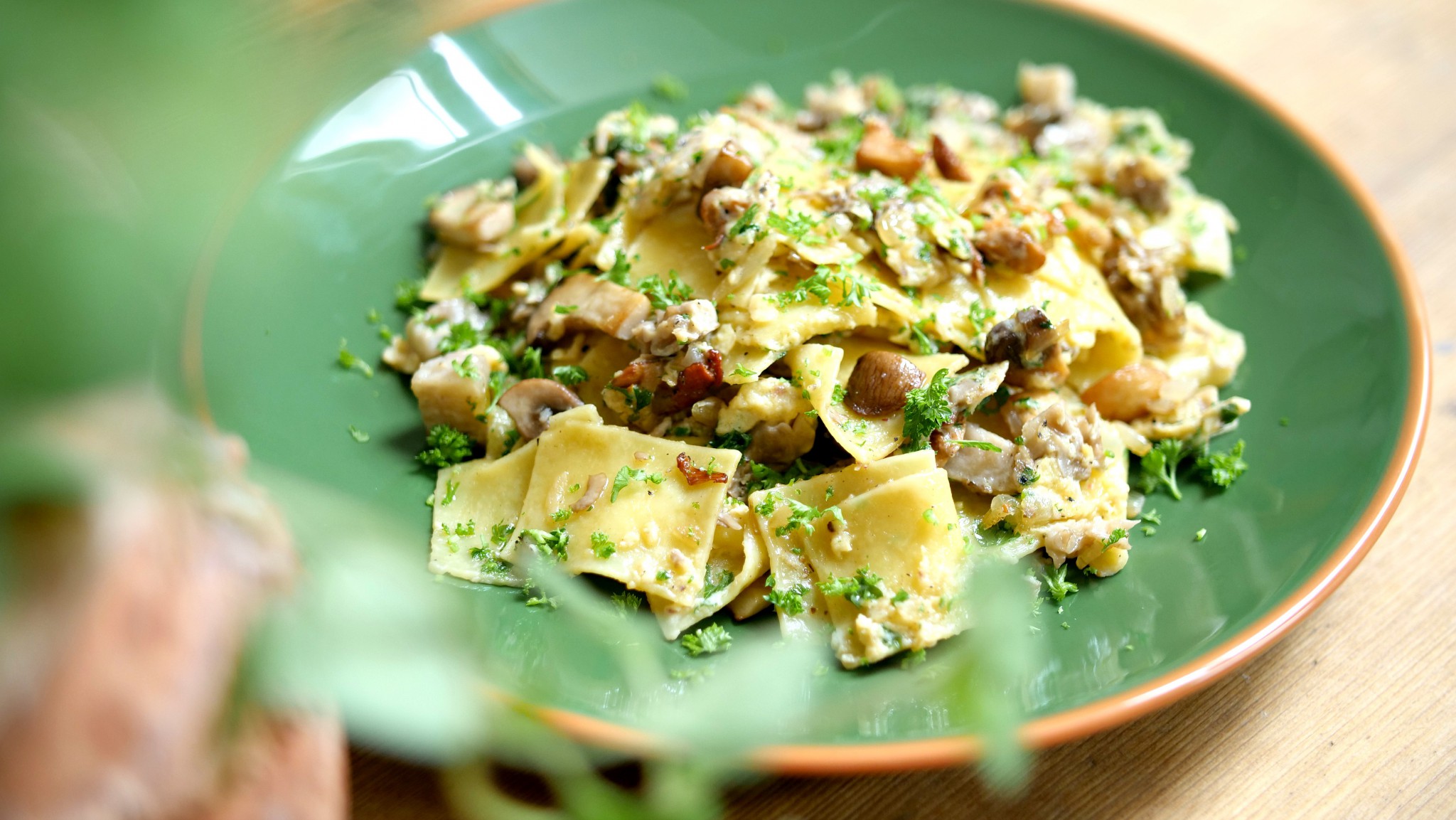 Začněte nakrájením těstovin a očištěných hub. Chceme si do nich přeci jen trochu kousnout, na pánvi se navíc smrsknou, takže žádné minikousky. Předkrájejte si i na jemno cibulku, jarní cibulku nebo šalotku. Stejně tak petrželku. I směs vajec a smetany či mléka si můžete připravit dopředu – takže osolit, opepřit a promíchat. Trochu tekutiny se k vejcím přidává proto, aby se na pánvi zbytečně nevysušila. Začněte velmi rozpálenou pánví, na kterou dáte trochu oleje, sádla nebo přepuštěného másla. Na těchto tucích jsou houby schopné se opravdu pěkně opéct. Na normálním másle začnou pouštět vodu a dusit se, protože nevydrží takovou teplotu, jinak by se přepalovalo, a tak automaticky člověk pak snižuje teplotu plotny. Nakrájené houby rozmístěte po pánvi a prostě nechte takhle ležet a pouštět páru klidně 5 minut. Bez míchání, bez třepání. Styčná strana řezů zázračně zezlátne. Až pak to míchněte, opeptřete a osolte. Ztlumte plamen tak na třetinu výkonnosti plotýnky a přidejte cibulku. Teď už míchejte a čekejte další minuty, dokud nezměkne. Případně přidejte trochu tuku. Během toho už vařte vodu na těstoviny spolu s dostatkem soli. Uvařte těstoviny podle návodu (většinou stačí 3 až 8 minut podle druhu). Na pánvi u hub a cibule rozpusťte máslo. Ihned po slití těstovin vše dobře promíchejte,ať se fleky nezmění v cucky. Přidejte petrželku a taky vaječnou směs. Jedno vejce na porci je opravdové minimum, možná budete preferovat větší množství. Stále míchejte. Pokud by vejce nechtěla zatuhnout, pánev na chvilku přikryjte poklicí. Do dvou minut ať už všichni sedí u stolu.