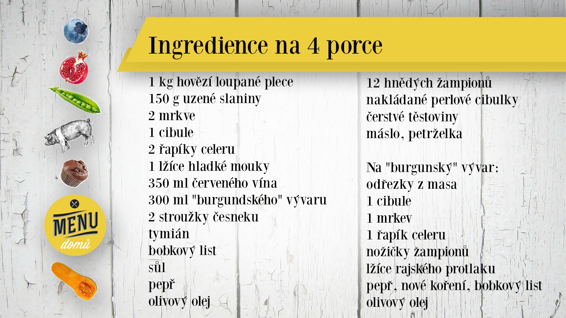 V základu jsem postupovala podle Julie Child a jejího receptu v knize Moje francouzská kuchyně. Ale protože jsem vařila ve své kuchyni, přeci jen jsem si vymyslela nějaký ten trik navíc, který by měl celou věc ulehčit. Výsledný efekt však zůstane grandiózní. Je to recept na dlouhé lokte, takže se vyplatí udělat dvojnásobnou porci a buď pozvat i sousedy a nebo prostě polovinu výsledku (bez žampionů, které není problém orestnout čerstvé těsně před ohřevem) zamrazit na dobu, kdy se budete potřebovat blýsknout v minimálním čase s maximálním efektem. A protože nechci, aby recept působil jako sebevražedná mise, pojďme ho raději hodit do několika krátkých bodů. Není to složité. Jen trochu zdlouhavé. Proto klidně připravte maso i omáčku den dva předem. Chuťově to bude naopak ještě lepší. A v den D přidáte žampíky, cibulky, ohřejete to a budete se soustředit jen na jednoduchou přílohu. Žádný stres.