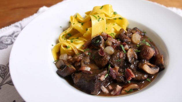 A co se týče přílohy, nejčastěji se dneska hovězí po burgundsku servíruje s poctivou bramborovou kaší, ale Julia doporučuje vařený brambor, rýži a nebo těstoviny. S širokými čerstvými nudlemi na másle s petrželkou chod chutná naprosto famózně a pokud je koupíte chlazené, máte přílohu vyřešenou za pár minut a prakticky bez práce.