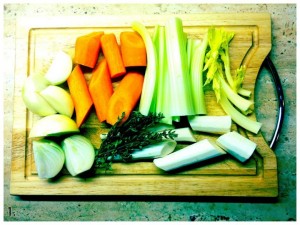 Potřebujeme 1 velkou mrkev, 2 menší cibule, 3 řapíky celeru (nebo půl malého celeru), 2 malé petržele a pár větviček tymiánu.