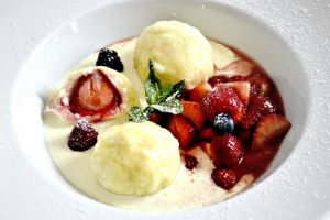 V té chvíli už si nechte měknout i máslo na těsto na knedlíky. Po 15 minutách z lednice bude připraveno. Udělat je trvá de facto pár minut, nic obtížného. Nejdřív si dejte vařit hrnec s vodou. Smíchejte všechny složky těsta na válu nebo kuchyňské lince. S moukou ze začátku šetřete. Tenhle druh těsta se vám bude lepit na ruce vždycky. Pokud by se už vůbec nelepil, byly by knedlíky po uvaření příliš tuhé. Takže mouky jen tolik, kolik je nezbytné, klidně začněte nejdřív na 100g a přidávejte. Prodělané těsto vytvarujeme do válce a ukrajujeme takové kusy, aby stačily na obalení jahod. Vrstva těsta je max. půl centimetru. Varem trochu nabyde. Knedlíky srocujte na troše hrubé mouky a hned, jak doděláte poslední, by voda už dávno měla vařit, pomalu je tedy vkládejte do ní. Knedle by neměly před varem dlouho odpočívat. Vaří se cca 8 minut. Extrémně malé 6-7 min, obři tak 9 min. Pak by se těsto začalo rozvařovat. Až se budete chýlit s varem ke konci, na másle jen prohoďte kusy očištěných jahod. Knedlíky opatrně vyjměte, propíchněte každý vidličkou, popřípadě potřete máslem, pokud ihned nepodáváte, a je hotovo. Knedlíky jsou horké, jahody vlažné a omáčka studená.