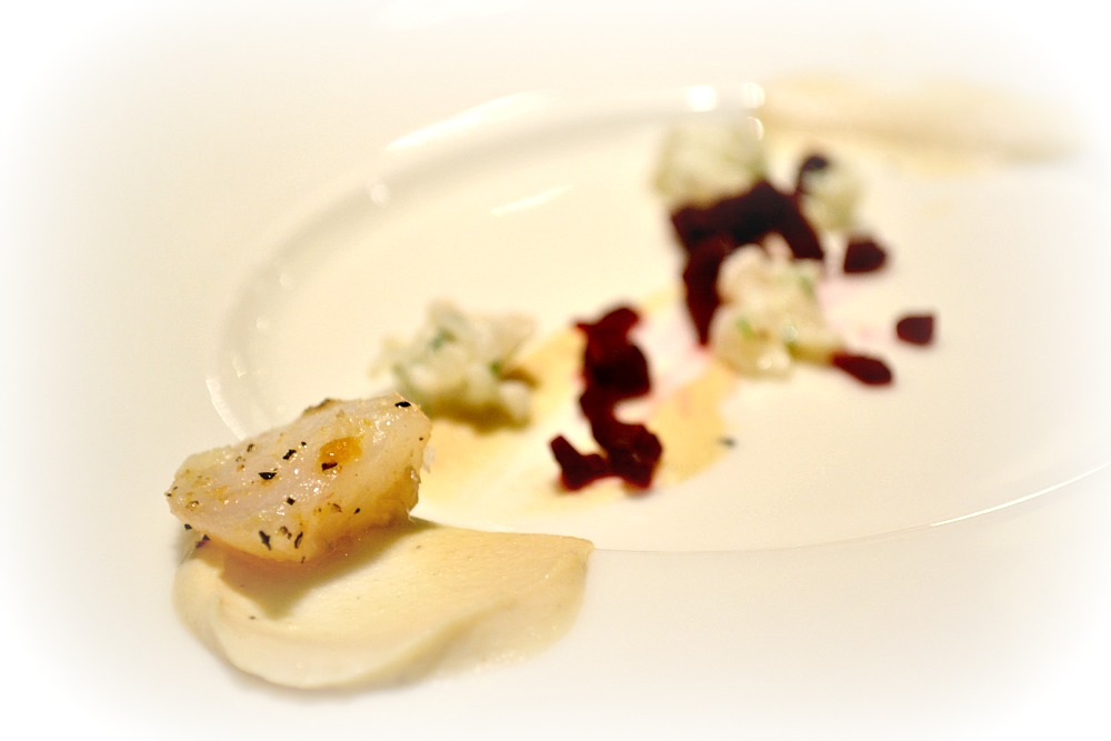 Amuse-bouche. Candátí líčka – jedno pečené a jedno v tataráku, plus červená řepa a pyré z jemně zauzeného květáku. Nebo jemně zauzené pyré z květáku… :-D Peklo si pamatovat vždycky každý roztěr na talíři. Plus ta vína k tomu… Koko je hlava děravá. Alespoň si pamatuju, že mi to vážně chutnalo, to je důležitější.